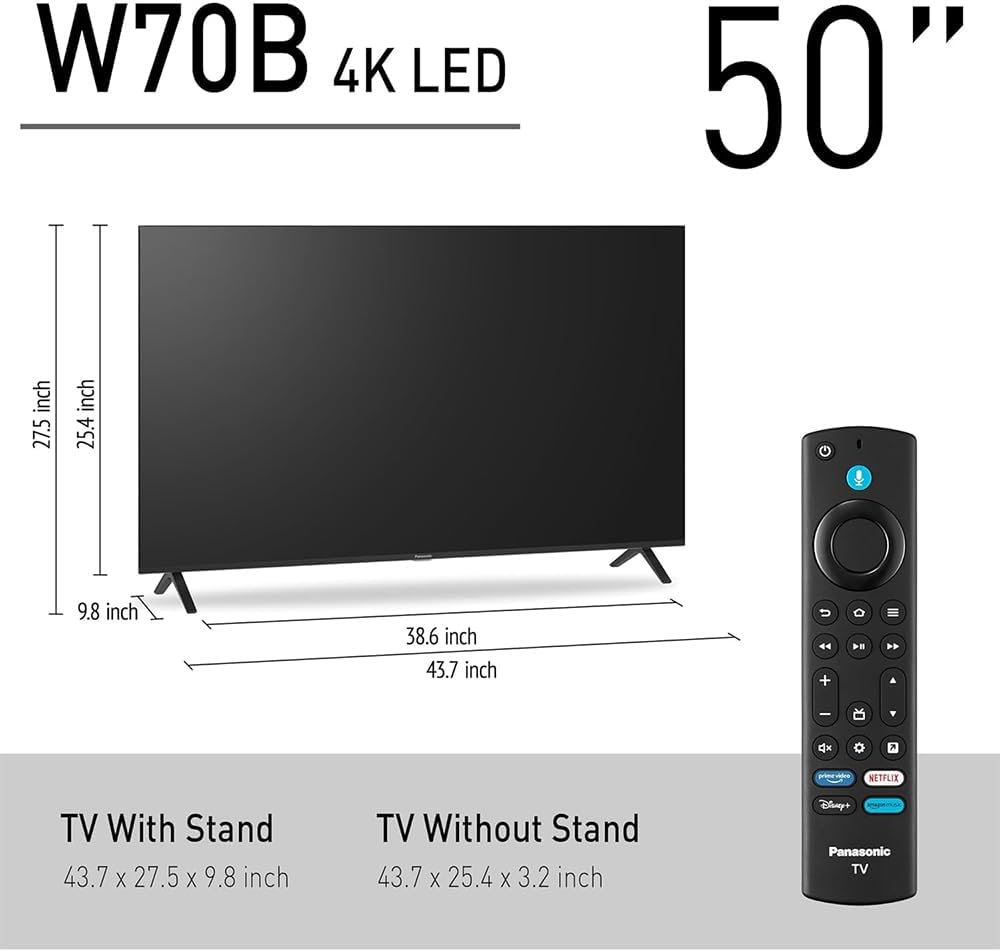 IN THE BOX: Panasonic W70 Series 50 inch LED 4K Ultra HD Smart Fire TV – Quick Start Guide – Owner’s Manual – Power Cable – TV Remote
