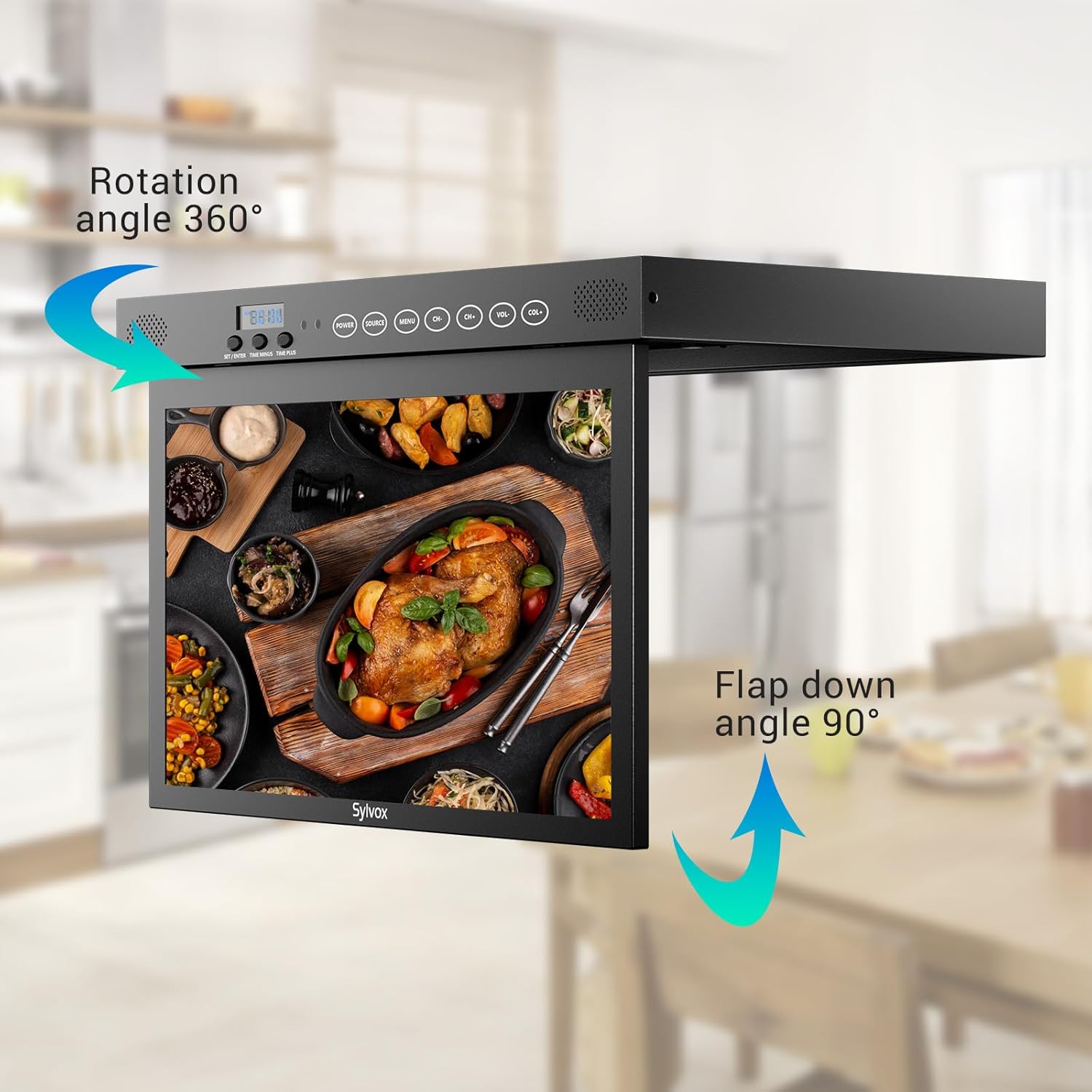 【Foldable & Rotatable Screen】This kitchen TV can flap down at a 90° angle and rotate up to 360°, allowing you to find the perfect viewing angle no matter where you are in the kitchen. It can also be easily installed inside a cabinet or under the roof, saving valuable counter space.